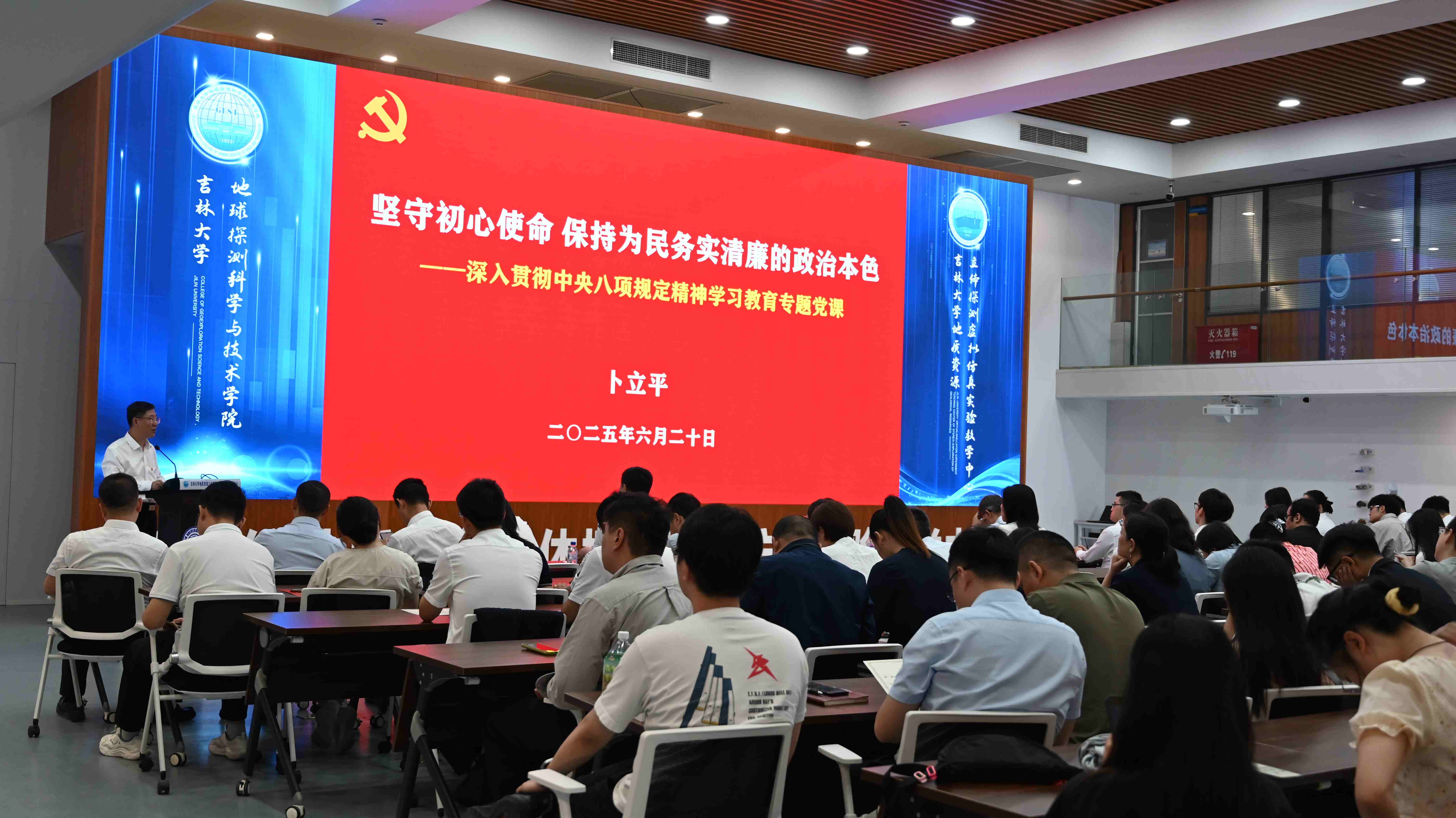 卜立平系统梳理了党的十八大以来主题教育学习目的和深远意义,强调全面从严治党永远在路上,党的自我革命永远在路上,作风建设永远在路上。他围绕深刻领会八项规定精神学习教育的政治意义和现实意义,坚持学查改一体推进学习教育见行见效,在实践中彰显为民务实清廉政治本色等三个方面进行了系统阐述。他表示,深入贯彻党的八项规定精神学习教育以来,学院坚持结合融入、开门学习教育,将学习习近平总书记关于加强党的作风建设的重要论述与黄大年同志先进事迹贯通融合,各项事业呈现出良好的发展态势。希望全院党员师生切实把思想和行动统一到党中央的决策部署上来,以更加坚定的决心、更加有力的措施,持之以恒地抓好作风建设,为学校、学院的发展夯实坚强的思想保障、政治保障。卜立平寄语全体毕业生党员,将个人理想融入国家发展大局,将专业所学转化为报国行动,以“功成不必在我,功成必定有我”的胸怀,在智能探测的战场上攻坚克难,在地球探测科学技术的前沿阵地开拓创新,踔厉奋发,笃行不怠,共同为我国地学事业发展和国家繁荣富强贡献力量。