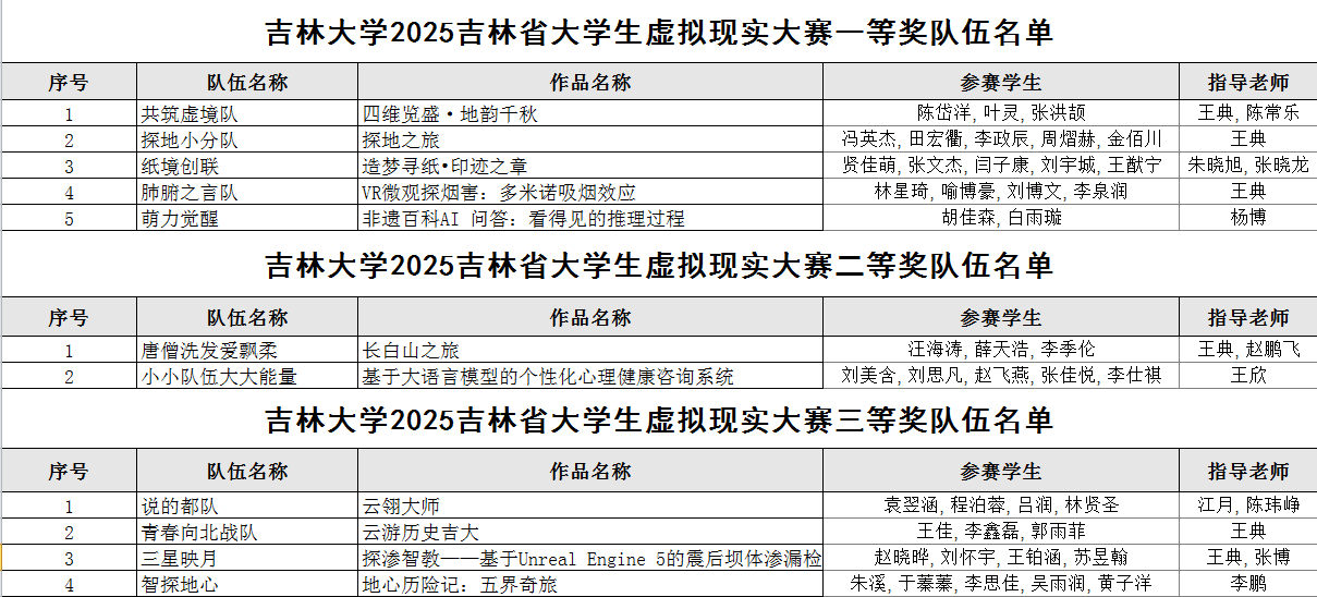 11月16日,2025吉林省大学生虚拟现实大赛决赛在长春人文学院圆满落幕。来自地质资源立体探测虚拟仿真实验教学中心代表队表现卓越,在2025吉林省大学生虚拟现实大赛中荣获一等奖五项、二等奖两项、三等奖四项的优异成绩,展现了中心在虚拟现实领域的教学实力与人才培养成果。