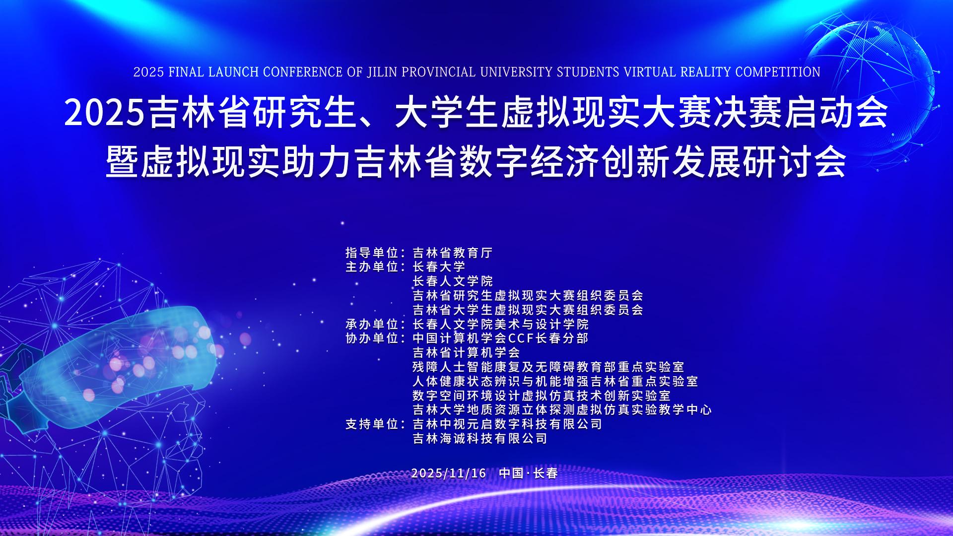 2025年11月16日,在吉林省教育厅的指导下,由长春大学、长春人文学院、吉林省研究生虚拟现实大赛组织委员会、吉林省大学生虚拟现实大赛组织委员会联合主办,我校美术与设计学院承办,中国计算机学会CCF长春分部、吉林省计算机学会、残障人士智能康复及无障碍教育部重点实验室、人体健康状态辨识与机能增强吉林省重点实验室、数字空间环境设计虚拟仿真技术创新实验室、吉林大学地质资源立体探测虚拟仿真实验教学中心共同协办,吉林中视元启数字科技有限公司、吉林海诚科技有限公司提供支持的2025吉林省研究生、大学生虚拟现实大赛决赛暨“虚拟现实助力吉林省数字经济创新发展”研讨会在长春人文学院隆重举行。